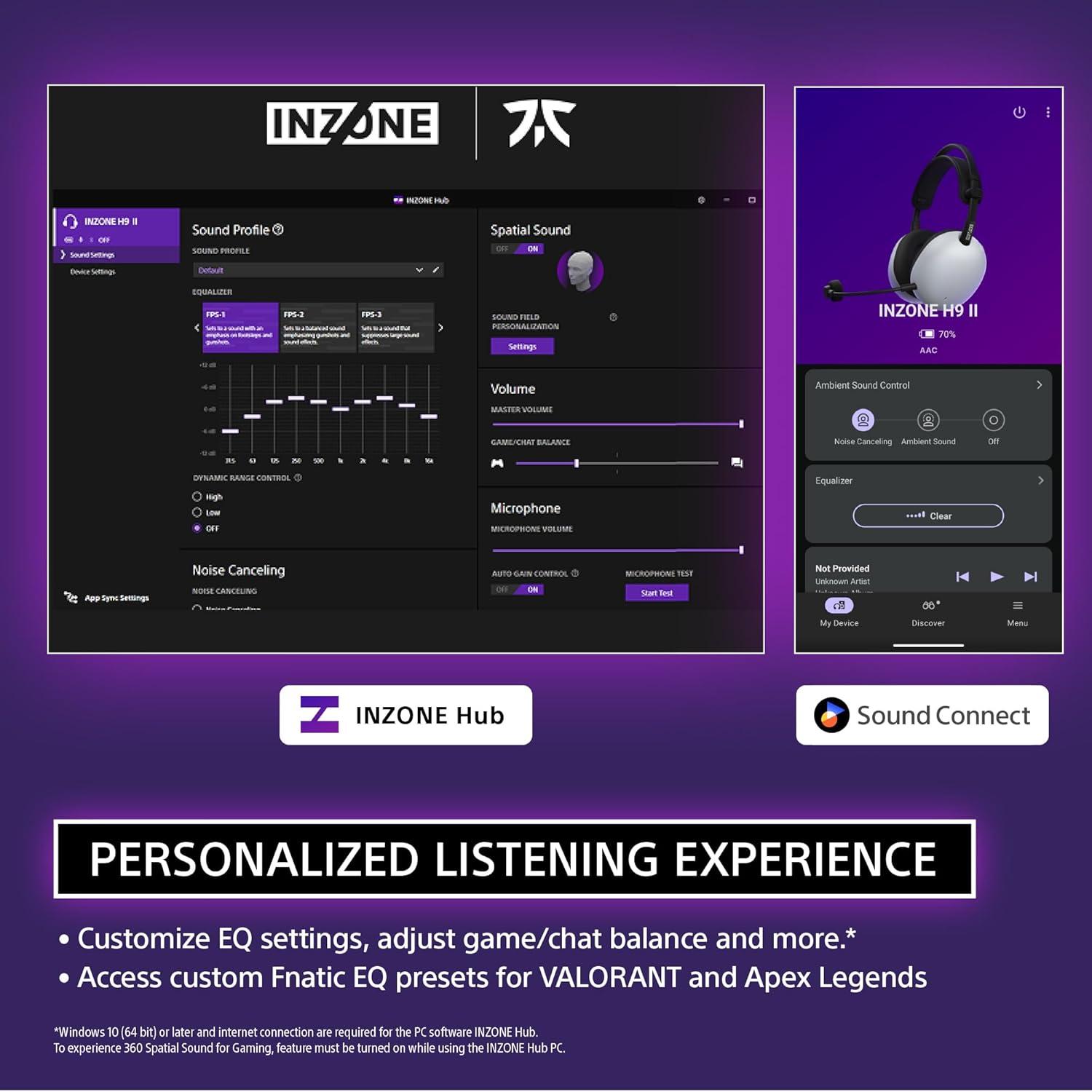 CUSTOMIZABLE SOUND: Fine-tune your audio experience with EQ presets, spatial sound, and mic controls using the INZONE Hub software (PC/Windows) or Sony | Sound Connect App (Mobile).